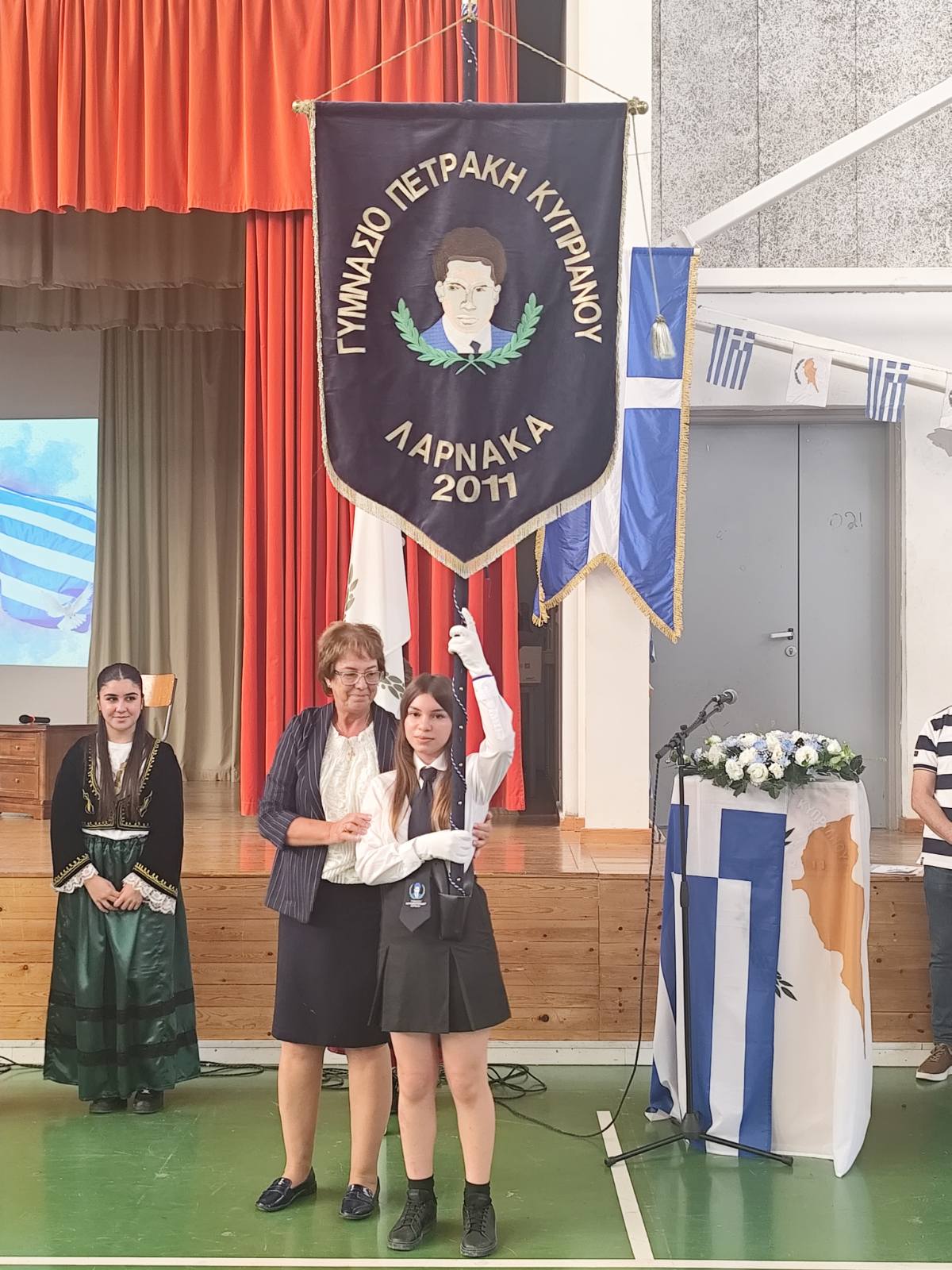 Ο καθηγητικός σύλλογος του Γυμνασίου Πετράκη Κυπριανού με την 4η πράξη επικύρωσε τη σύνθεση του αγήματος. Οι άριστοι μαθητές και μαθήτριές μας παρέλαβαν το λάβαρο και τις σημαίες από τη διευθύντρια του σχολείου κ. Χαρά Δημοσθένους.
